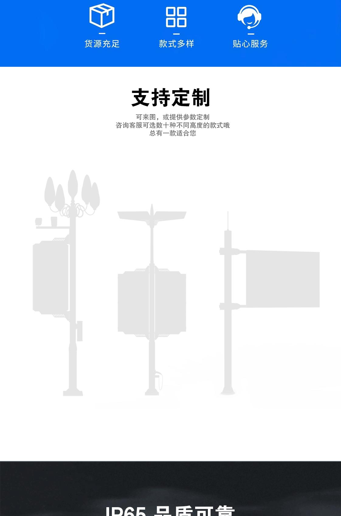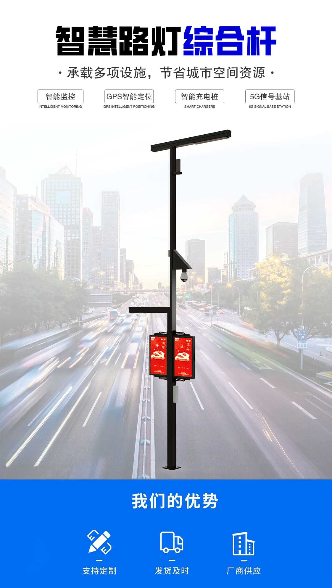 集成了微氣象傳感器、WiFi設備、LED照明、人流監(jiān)控傳感器、5G通訊基站、搶形攝像機、LED燈桿屏、空氣質(zhì)量傳感器、球形攝像機、一鍵報警、井蓋垃圾桶傳感器、水浸傳感器等各種設備多功能多用途燈桿。在接入互聯(lián)網(wǎng)+物聯(lián)網(wǎng)+大數(shù)據(jù)的技術支持下,實現(xiàn)聯(lián)動產(chǎn)業(yè)鏈融合發(fā)展,構建完善的管理系統(tǒng),從而提升設備工作成效,降低人工管控成本。