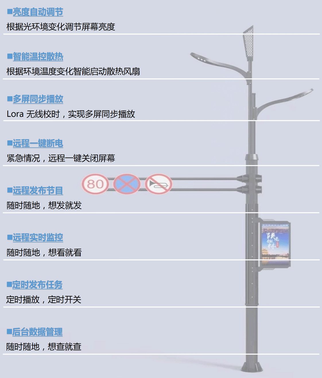一款依托互聯(lián)網(wǎng)、物聯(lián)網(wǎng)等信息技術(shù)為基礎(chǔ),作為智慧城市的顯示終端,能夠?qū)崿F(xiàn)遠(yuǎn)程集群管理操控的戶外終端設(shè)備。帶視頻監(jiān)控、語音廣播以及亮度自動(dòng)調(diào)節(jié),專為戶外場(chǎng)景設(shè)置,設(shè)有防水、防雷等功能,設(shè)有防水防雷等功能,亮度水平≥7000it,專為戶外場(chǎng)景設(shè)置。外觀顏色有黑/灰/紅/橙等顏色,支持定制。鑄鋁LED燈桿屏,箱體采用鋁材質(zhì),箱體輕薄,安裝簡(jiǎn)單操作方便,適配于不同樣式、高度的智慧燈桿。適用于各高速、交通要道、景區(qū)、賽事場(chǎng)館等。